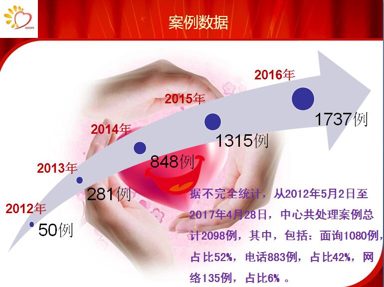 從上圖數(shù)據(jù)可以直觀的看出 自2014年開始,中心接受案例數(shù)據(jù)呈現(xiàn)大幅度增長,這要感謝秦皇島市海港區(qū)文明辦的大力支持;感謝各界媒體的關(guān)注和宣傳。