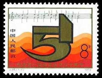 先介紹第一枚郵票,那是中國(guó)人民郵政在1979年5月1日發(fā)行的《紀(jì)念“五一”國(guó)際勞動(dòng)節(jié)九十周年》紀(jì)念郵票。該套郵票志號(hào):J.35,全套郵票1枚,面值:8分,票名:鐮刀和鐵錘,設(shè)計(jì)者:鄧錫清。