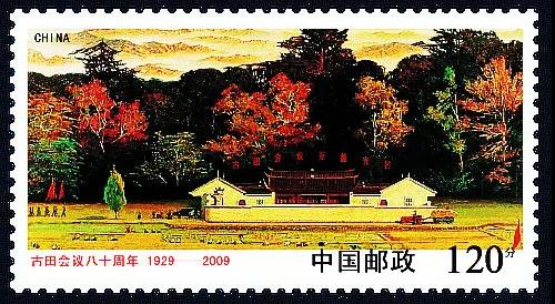 2009年12月28日上午,《古田會議八十周年》紀念郵票首發(fā)式在福建省龍巖市隆重舉行。福建省,中國郵政集團公司的領導,以及龍巖市四大班子領導、福建省郵政公司領導和嘉賓出席了郵票首發(fā)式,并為《古田會議八十周年》紀念郵票首發(fā)揭幕?!豆盘飼h八十周年》紀念郵票一套一枚,面值1.2元,郵票圖案為著名畫家王路1972年的作品――《古田會議染層林》油畫。