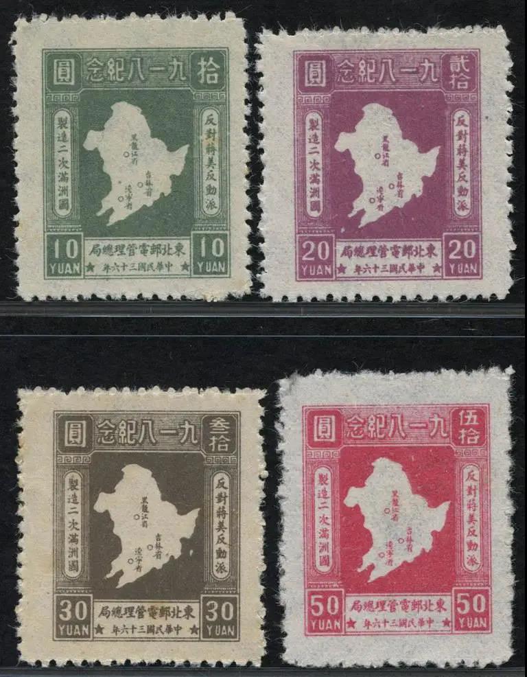 該套郵票一套4枚,圖案相同,就是刷色和面值各異。郵票的圖案主體為中國(guó)東北三省地圖,圖中明確標(biāo)明三省省會(huì)的位置和各省名稱。圖案上方印刷郵票主題―“ 九一八紀(jì)念”,下方印刷“ 東北郵電管理總局★中華民國(guó)三十六年★”發(fā)行單位和發(fā)行時(shí)間,左右兩側(cè)印刷當(dāng)時(shí)的口號(hào)“ 反對(duì)蔣美反動(dòng)派,制造二次滿洲國(guó)”。這套郵票是由哈爾濱廣發(fā)印刷所承印,特別值得一提的是,該套郵票所用的紙張系為原偽滿洲國(guó)郵政局遺留庫(kù)存的水印絹絲紙,這也是“九一八事變”之后日本侵略者侵占了東北三省長(zhǎng)達(dá)14年的證據(jù)之一(當(dāng)時(shí)庫(kù)存之大,甚至到建國(guó)后,新中國(guó)發(fā)行的東普二也使用這款“ 水印紙 ”)。
