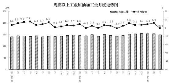 原油加工量下降。4月份,原油加工量4445.2萬噸,同比下降0.6%;日均加工量148.2萬噸,比3月份下降3.3%,這主要是受部分大型石化企業(yè)停產(chǎn)檢修影響。主要成品油生產(chǎn)也有所回落,其中,汽油產(chǎn)量同比下降4.0%,煤油產(chǎn)量增長2.2%,柴油產(chǎn)量下降0.6%。1-4月份,原油加工量18251.0萬噸,同比增長3.1%,比1-3月份回落1.4個(gè)百分點(diǎn)。
