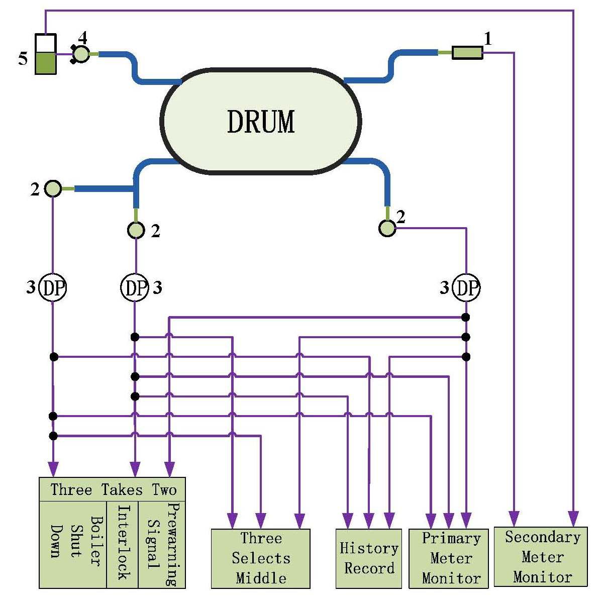 (5)保護(hù)系統(tǒng):“三取二”水位停爐、聯(lián)鎖、熱工報(bào)警系統(tǒng)信號(hào)取自二套電接點(diǎn)水位計(jì)和自動(dòng)調(diào)節(jié)系統(tǒng)“三選中”開(kāi)關(guān)量輸出信號(hào)。