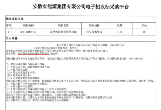 2022年3月18日,安徽某發(fā)電公司“電接點(diǎn)水位計(jì)改造項(xiàng)目”招標(biāo)結(jié)果公示,秦皇島華電測控設(shè)備有限公司被評選為中標(biāo)單位。中標(biāo)產(chǎn)品“高精度取樣電極傳感器”,數(shù)量4套,本月底前我公司將完成施工改造。