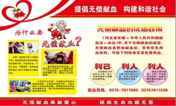 獻血救人,是人類文明的表現(xiàn)。無償獻血利國、利己、利家人。適量獻血是安全、無害的。健康的成年人,每次采集的血液量一般為200毫升,最多不得超過400毫升,兩次采集間隔期不少于6個月?!吨腥A人民共和國獻血法》規(guī)定,“國家提倡十八周歲至五十五周歲的健康公民自愿獻血,”“對獻血者,發(fā)給國務院衛(wèi)生行政部門制作的無償獻血證書,有關單位可以給予適當補貼”。血站是采集、臨床用血的機構,一定要到國家批準的正規(guī)血站獻血。