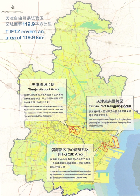 天津自貿(mào)區(qū)2014年12月31日獲國務(wù)院正式批復(fù),2015年4月21日正式掛牌,總面積119.9平方公里,是我國北方第一個自貿(mào)試驗區(qū),也是繼上海成立自貿(mào)區(qū)以來,與福建、廣東同時獲批的第二批自由貿(mào)易試驗區(qū)之一。其產(chǎn)業(yè)定位涵蓋了面積30平方公里,以發(fā)展航運物流、國際貿(mào)易、融資租賃等現(xiàn)代服務(wù)業(yè)為主的天津港東疆片區(qū);面積43.1平方公里,以發(fā)展高端制造業(yè)和與之配套的生產(chǎn)性服務(wù)業(yè)為主的天津機(jī)場片區(qū);面積46.8平方公里,以發(fā)展金融創(chuàng)新為主的現(xiàn)代服務(wù)業(yè)濱海新區(qū)中心商務(wù)片區(qū)三個片區(qū)。