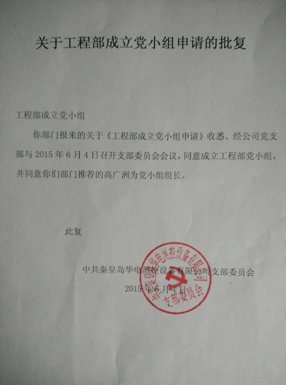 秦皇島華電測控設(shè)備有限公司黨組織同意工程部成立黨小組的批復(fù)
