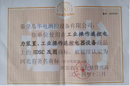近日,公司收到河北省工商行政管理局頒發(fā)的“河北省著名商標”證書。這是公司使用在工業(yè)操作遙控電力裝置、工業(yè)操作遙控電器設(shè)備商品上的HDSC及圖商標,繼2008年首次被認定為“河北省著名商標”后的連續(xù)認定,證書編號為:2014Y644。