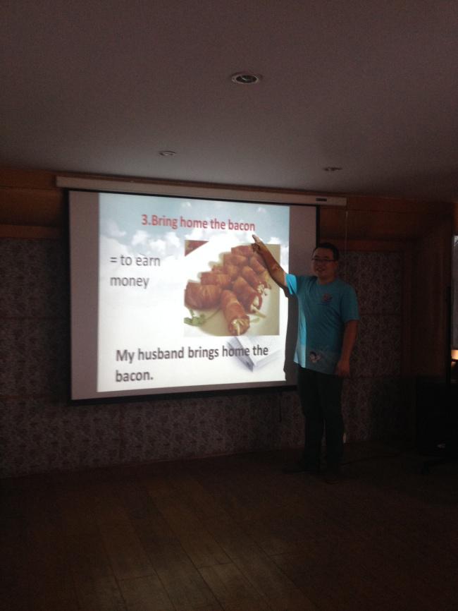 In the first section they learnt “Food idioms”. With attractive pictures shown in the screen, they learnt ten food idioms together, such as piece of cake(=something easy), to go bananas(= to become crazy), bring home the bacon(=to earn money), have bigger fish to fry(=have more important things to do ),like two peas in a pod(very similar), eat like a horse(=eat a lot), as red as a cherry(= very red)…… All these idioms are very useful in our daily life. Next section was for oral English. They learnt how to convey “Thank you” or “Sorry” and how to answer them in different ways. Some of us may be confused how to respond “Thank you” or “Sorry” in English at times. After this section, they had a better understanding of the differences. At last, they had a test to check whether or not they had benefitted from the English Corner.