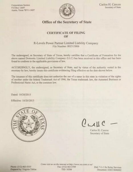 【企業(yè)要聞】喜訊:秦皇島華電測控設備有限公司美國分公司R-Levels Power Partner LLC完成注冊!