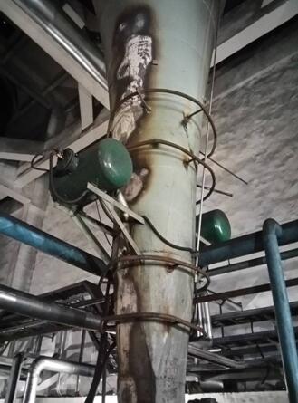 為了不影響正常的運(yùn)行,該廠采用了空氣炮、氣旋管、人工疏松等辦法進(jìn)行處理,但是收效甚微,直至今日空氣炮儼然成為了雞肋,為了保證安全運(yùn)行鍋爐運(yùn)行人員必須每班安排專(zhuān)人進(jìn)行維護(hù),大量消耗了人力與物力。為解決煤倉(cāng)堵煤、棚煤?jiǎn)栴},該廠決定在十臺(tái)煤倉(cāng)上安裝我公司煤倉(cāng)疏松機(jī),下圖為現(xiàn)場(chǎng)施工人員安裝我公司煤倉(cāng)疏松裝置。