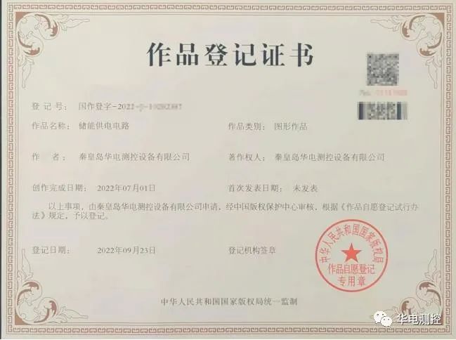 熱烈祝賀華電測控知識產(chǎn)權(quán)再添一員” 2022-10-262022年9月26日,秦皇島華電測控設(shè)備有限公司收到中華人民共和國國家版權(quán)局頒發(fā)的《儲能供電電路——作品登記證書》。