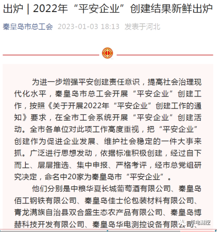 秦皇島華電測控設(shè)備有限公司被命名為2022年秦皇島市“平安企業(yè)”” 2023-01-212022年,為進一步增強企業(yè)安全生產(chǎn)主體責任和全員安全責任意識,有效提升企業(yè)安全管理水平,秦皇島華電測控設(shè)備有限公司響應(yīng)秦皇島總工會開展的“平安企業(yè)”創(chuàng)建工作,按照《關(guān)于開展2022年“平安企業(yè)”創(chuàng)建工作的通知》要求,打造高標準“平安企業(yè)”。經(jīng)過嚴格考評,秦皇島華電測控設(shè)備有限公司被秦皇島市總工會命名為2022年秦皇島市“平安企業(yè)”。More